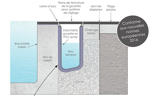 Système de goulottes permettant de construire une piscine miroir à débordement sans bac tampon.