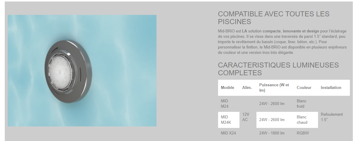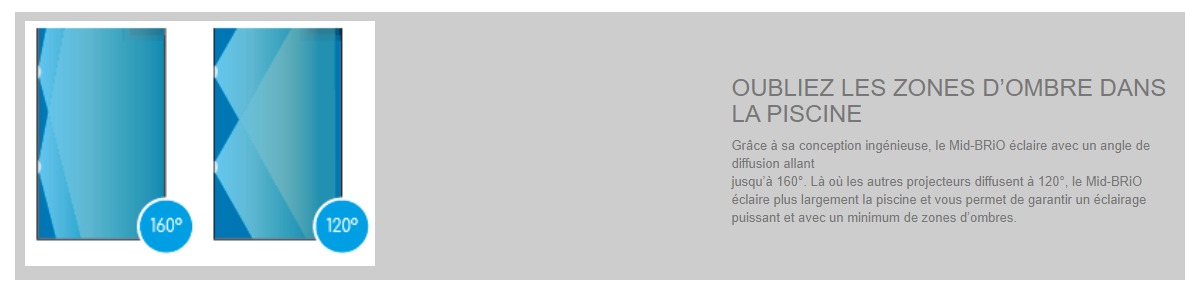 Avec Mid-BRiO, découvrez une nouvelle génération de projecteurs, plus compacts, plus puissants et plus diffusants ! Combinaison de nombreuses technologies, le Mid-BRiO offre un ratio puissance / lumens / taille inégalé dans le marché de la piscine. Eclairez vos piscines avec un projecteurs de seulement 75 mm de diamètre pour 2400 lm de lumière. Le Mid-BRiO s’installe dans les traversées 1.5’’ standard et propose un angle de diffusion de la lumière jusqu’à 160° : oubliez les zones d’ombre dans la piscine !