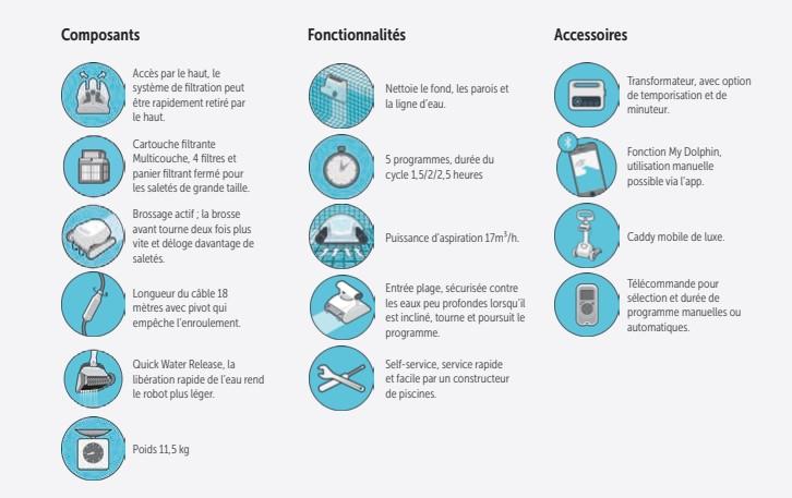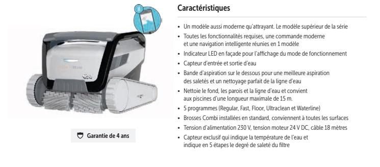 Nettoie le fond, les parois et la ligne d'eau et convient aux piscines d'une longueur maximale de 15 m.