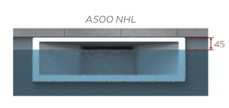 Spécialement conçu pour une intégration discrète, le skimmer A500 NHL, entièrement coloré, réhausse le niveau de l’eau à seulement 45mm sous l’arase.