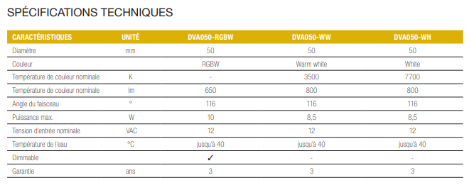 - RGBW : 14 programmes de couleurs fixes et de tons blancs, commande par ON/OFF ou communication PLC