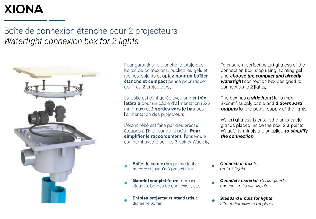 Boite de connexion permettant de raccorder jusqu'à 3 projecteursMatériel complet fourni : presse-étoupes, bornes de connexion, etc.Entrées projecteurs standards : diamètre 32 mmEntièrement étanche sans gel isolant. Presse-étoupes à l'intérieur de la boite.Idéal pour les piscines à débordement.Pour garantir une étanchéité totale des boites de connexions, oubliez les gels et résines isolants et optez pour un boitier étanche et compact pensé pour raccorder 1 ou 2 projecteurs.