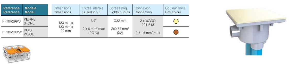 L'étanchéité est faite par des presse-étoupes à l'intérieur de la boite. Pour simplifier le raccordement, l'ensemble est fourni avec 2 bornes 3 points Wago.